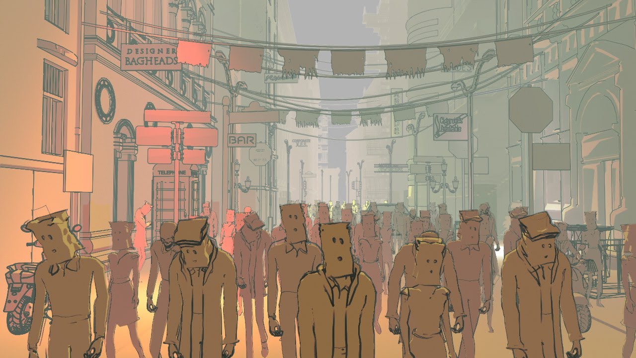 Schirkoa Animation World Network - After the implementation of the 'bag act' every citizen has to be a baghead.